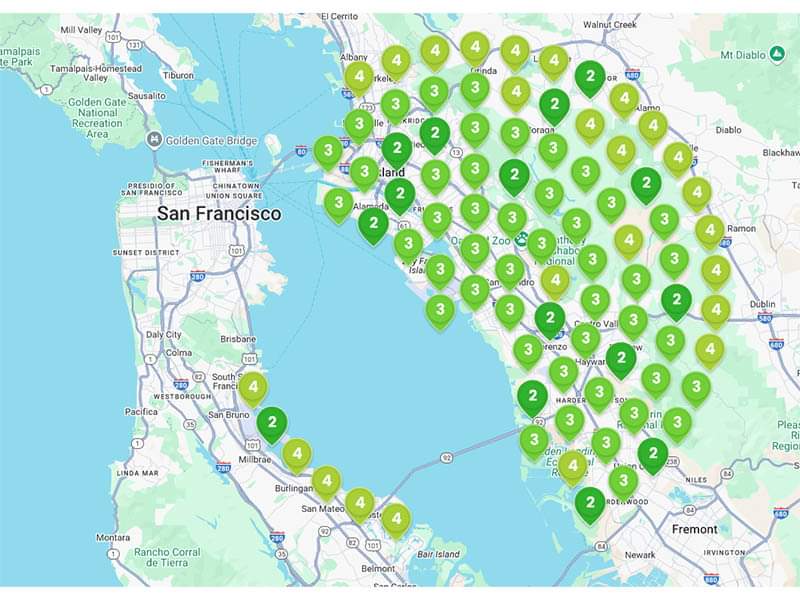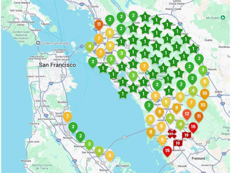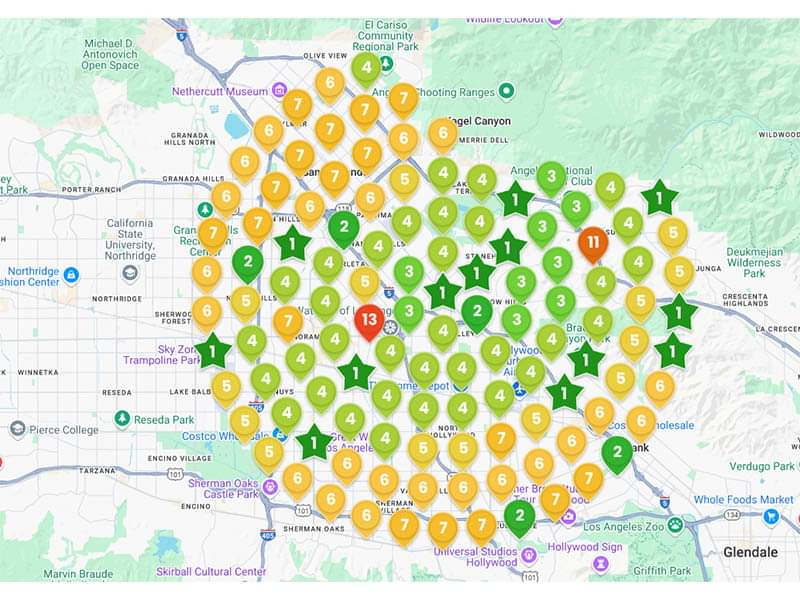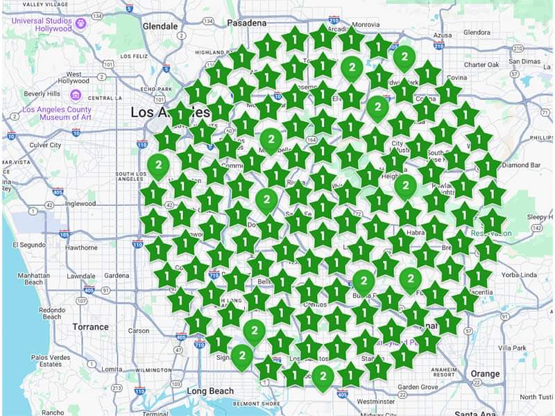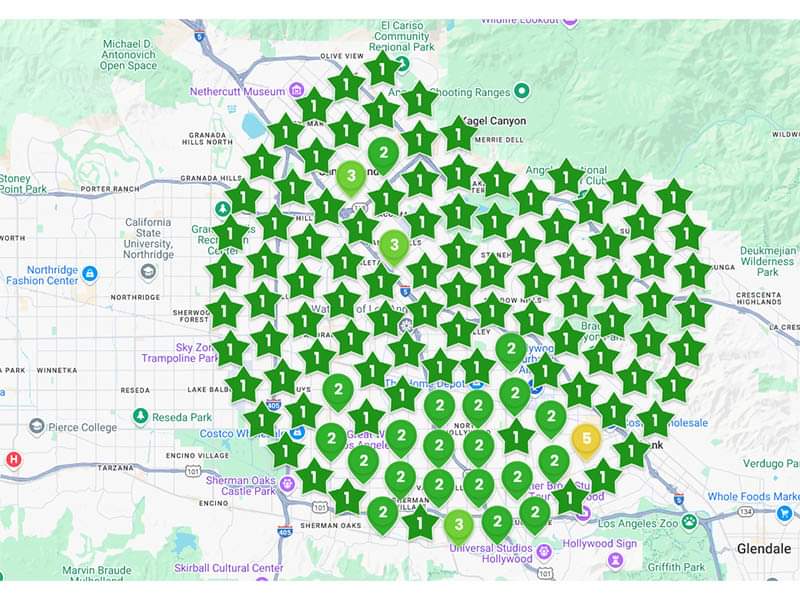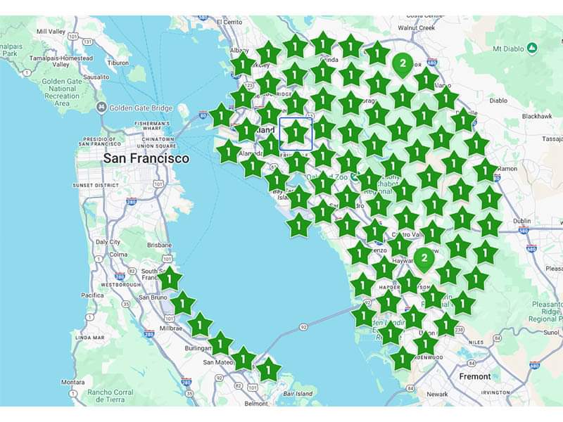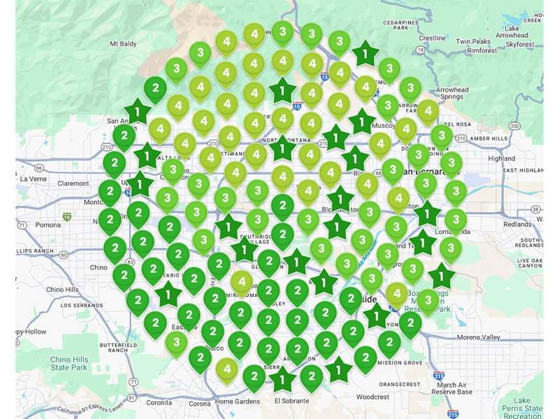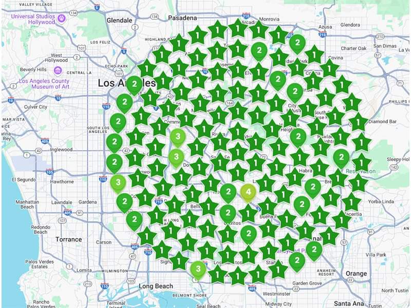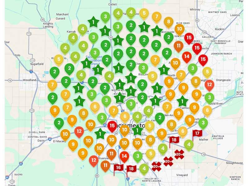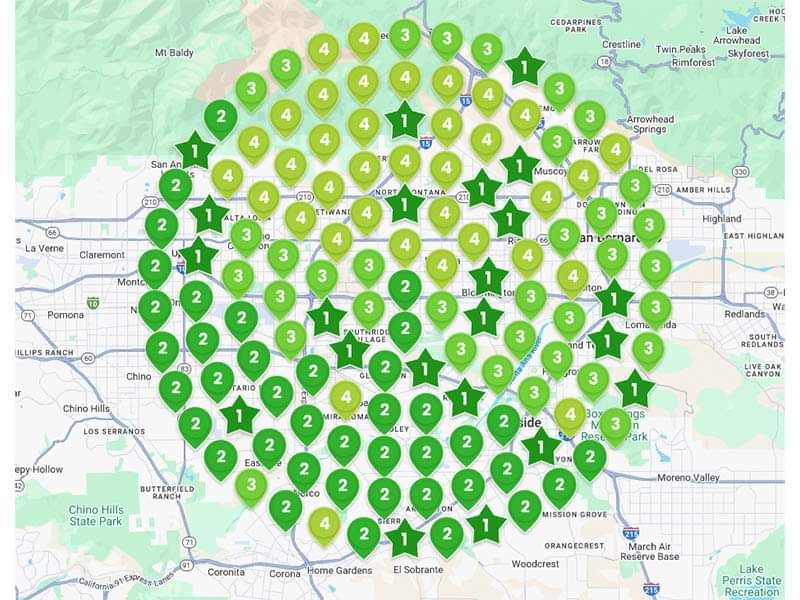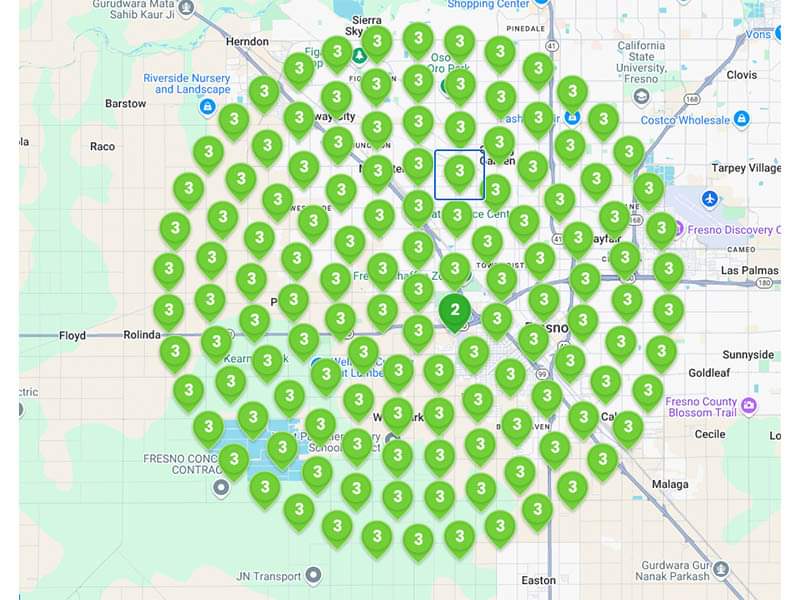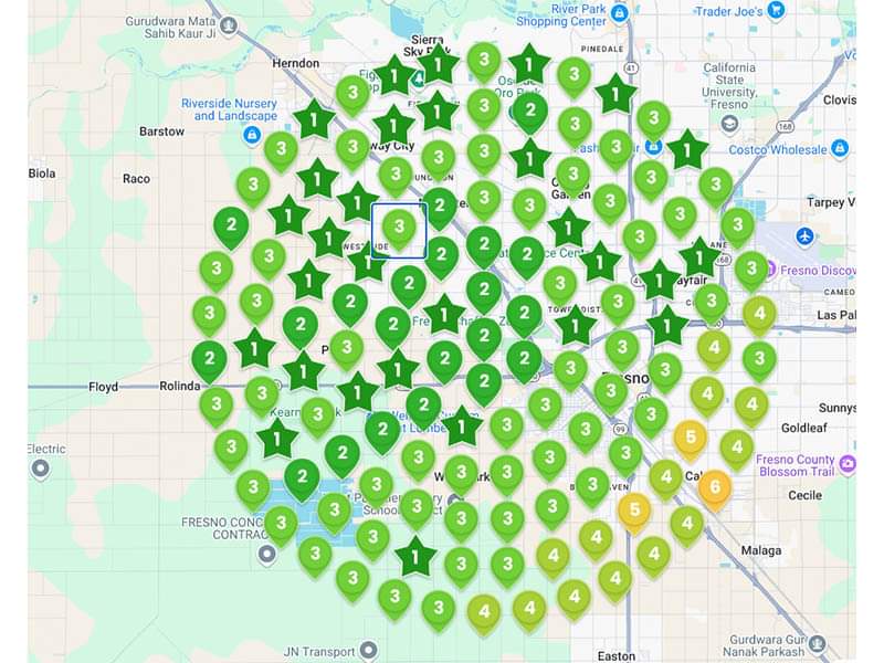 The numbers in the green stars or map icons represent the Google Local Pack ranking for a critical keyword.